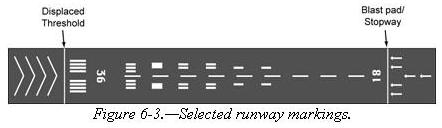There are markings and signs used at airports which provide directions and assist the pilot in airport operations. We will discuss some of the most common markings and signs. Additional information may be found in the Aeronautical Information Manual (AIM). Runway Markings Runway markings vary depending on the type of operations conducted at the airport. Figure 6-3 shows a runway which is approved as a precision instrument approach runway and also shows some other common runway markings. A basic VFR runway may only have centerline markings and runway numbers. Since aircraft are affected by the wind during takeoffs and landings, runways are laid out according to the local prevailing winds. Runway numbers are in reference to magnetic north. Certain airports have two or even three runways laid out in the same direction. These are referred to as parallel runways and are distinguished by a letter being added to the runway number. Examples are runway 36L (left), 36C (center), and 36R (right). Another feature of some runways is a displaced threshold. A threshold may be displaced because of an obstruction near the end of the runway. Although this portion of the runway is not to be used for landing, it may be available for taxiing, takeoff, or landing rollout.