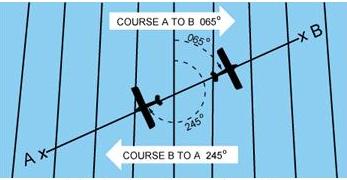 B would be a true course of 065°, whereas the return trip (called the