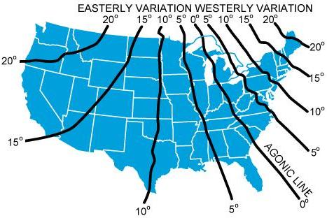 the west of true north. Zero degree variation exists on the agonic line