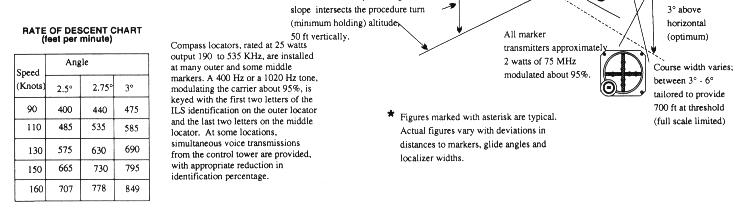 approaches. Localizer The localizer antenna array is located on the extended centerline of the instrument runway of an airport, remote enough from the opposite approach end of the runway to prevent the array from being a collision hazard. This unit radiates a field pattern which develops a course down the centerline of the runway toward the middle and outer markers, and a similar course along the runway centerline in the opposite direction. These courses are called the "front" and "back" courses, respectively. The localizer provides course guidance throughout the descent path to the runway threshold from a distance of 18 nautical miles from the antenna between an altitude of 1,000 feet above the highest terrain along the course line and 4,500 feet above the elevation of the antenna site. The radiated field pattern is modulated at two different frequencies. The right side of this pattern, looking along the normal approach path from the outer marker toward the runway, is modulated at 150 Hz. The left side of the radiated pattern is modulated at 90 Hz. The on-course path is formed by equi-signal points between the two modulated sides of the pattern, and becomes increasingly narrow as the transmitter is approached. The localizer course width is defined as the angular displacement at any point along the course between a full "fly-left" and a full "fly-right" indication on the aircraft course deviation indicator (CDI or localizer needle). The localizer signal is adjusted to produce an angular width between 3° and 6°, as necessary, to provide a linear width of approximately 700 feet at the runway approach threshold. In addition, the FAA localizer provides a full "fly-left" or full "fly-right" to an aircraft well outside the on-course area, preventing the possibility of a "false course." ILS Identification. Each localizer facility is identified by a 3-letter coded designator transmitted at frequent regular intervals. The identification is always preceded by the coded letter "I" to identify the received signal as originating at the ILS facility. For example, the ILS localizer at Springfield, Mo., transmits the identifier "ISGF." The localizer includes a voice feature on its frequency for use by the associated Air Traffic Control facility in issuing approach and landing instructions. The frequency band of the localizer equipment is 108.10 to 111.95 MHz. Glide Slope The term "glide slope" means the complete radiation pattern generated by the glide slope facility. The term "glide path" means that portion of the glide slope that intersects the localizer. The glide slope equipment is housed in a building approximately 750 to 1,250 feet from the approach end of the runway, between 400 and 600 feet to one side of the centerline. The course projected by the glide slope equipment is essentially the same as would be generated by a localizer operating on its side, with the upper side of the course modulated at 90 Hz and the lower side at 150 Hz. The glide slope projection angle is normally adjusted to 2.5 to 3 degrees above horizontal so that it intersects the middle marker at about 200 feet and the outer marker at about 1,400 feet above the runway elevation. At locations where standard minimum obstruction clearance cannot be obtained with the normal maximum glide slope angle, the glide slope equipment is displaced inward from the standard location if the length of the runway permits. Unlike the localizer, the glide slope transmitter radiates signals only in the direction of the final approach on the "front course." The system provides no vertical guidance for approaches on the "back course." The glide path is normally 1.4° thick. At 10 nautical miles from the point of touchdown, this represents a vertical distance of approximately 1,500 feet, narrowing to a few feet at touchdown. False Courses. In addition to the desired course, glide slope facilities inherently produce additional courses at higher vertical angles; the angle of the lowest of these "false courses" will occur at approximately 12.5. However, if your approach is conducted at the altitudes specified on the appropriate approach chart, these false courses will not be encountered. Marker Beacons Two VHF marker beacons, outer and middle, are normally used in the FAA ILS system. A third beacon, the inner, is used where Category II operations are certified. Also, a marker beacon may be installed to indicate the final approach fix on the ILS back course. These beacons have a power output of 3 watts or less and operate on a frequency of 75 MHz. The radiation patterns are fan-shaped with an elliptical cross-section with its minor axis parallel to the approach path and its major axis at right angles to the approach path. The Outer Marker (OM) is located on the front course 4 to 7 miles from